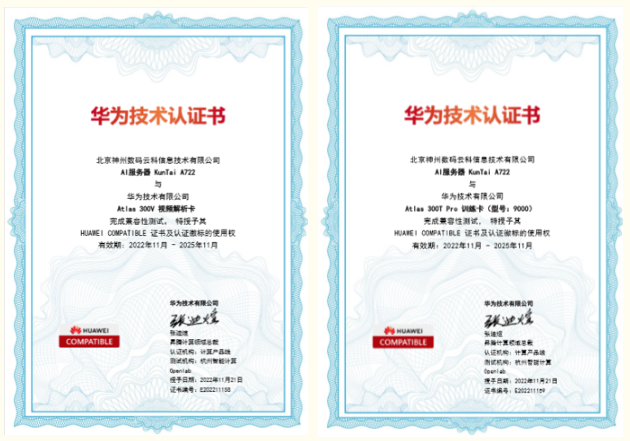 近期,天盛优配KunTai A722服务器顺利获得华为“Atlas 300V 视频解析卡”以及“Atlas 300T Pro 训练卡(型号:9000)”两项技术认证,为智能算力再添新力!